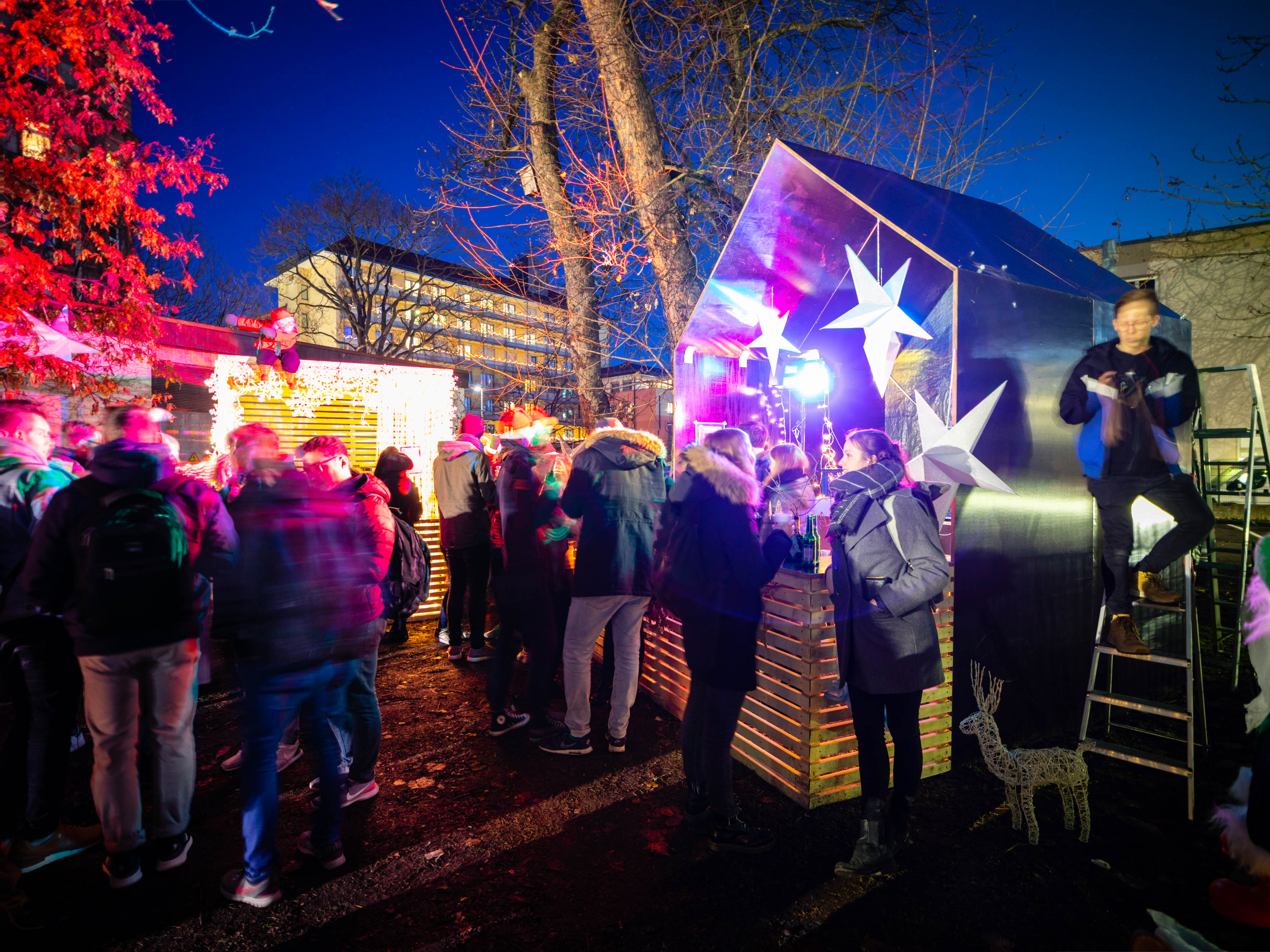 Die Adventsfeier entstand letztes Jahr mit dem Ziel, Spenden für die fünf Monate später anstehende „Eierfeier” (ehemals Nikofeier) zu sammeln. Carsten Schäfer (Leiter der Modellbauwerkstatt) hat damals zusammen mit fleißigen Helfern zwei Buden nach den Entwürfen der Professoren gebaut, die dieses Jahr wiederverwendet wurden. Über zwei Tage wurde nachmittags Glühwein, Bratwurst und Selbstgemachtes an den Mann gebracht. Stattgefunden hat das Ganze im Hof der Hochschule am Röntgenring 8.