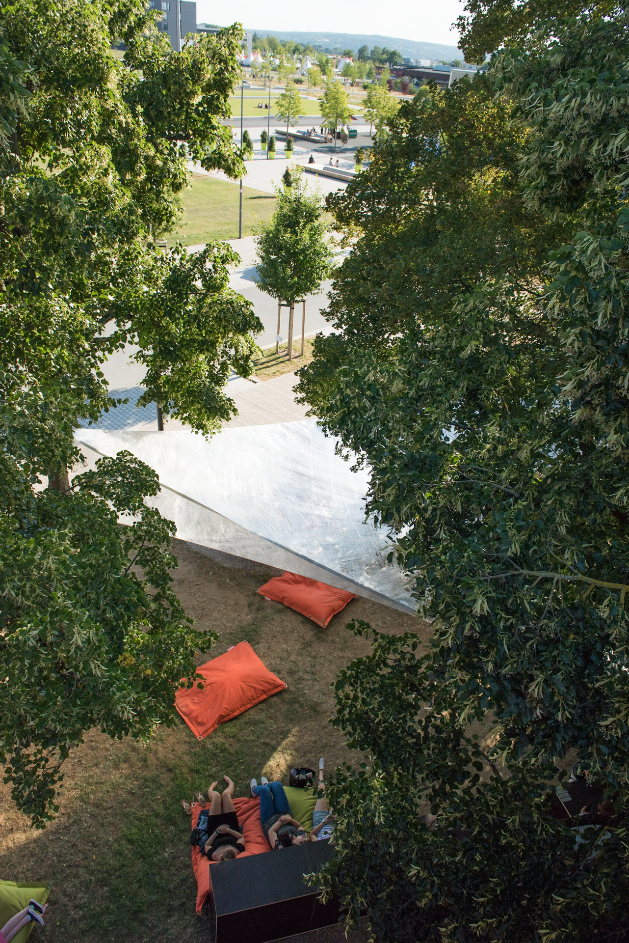 In den Genuss dieses Objektes kamen insbesondere die Besucher der Landesgartenschau 2018. Im Rahmen des Architekturwochenendes wurde die Installation vor dem Gebäude des LAB 13 zwischen Bäumen aufgespannt und speziell für diesen Ort zugeschneidert. Der Entstehungsprozess erstreckte sich über mehrere Tage. Dabei wurden organische Photovoltaikmodule des Herstellers Opvius integriert. Diese Anlage sammelte tagsüber die elektrische Energie, die nachts die Raumhülle in verschiedenste Lichtfarben tauchte.
