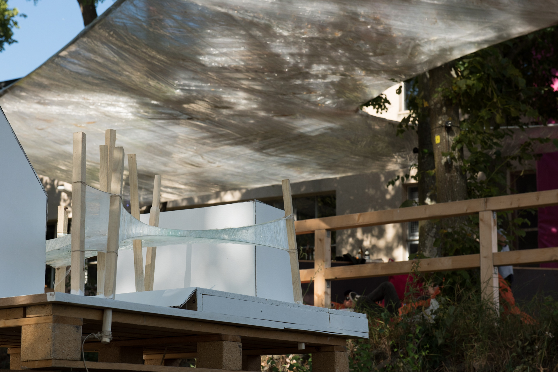 Die leichte spontane Architektur des Projektes besiedelt das direkte Umfeld des LAB 13 und überspitzt in seiner Ausformulierung den Prozess des Besetzens und Vernetztes von Dingen und Orten. Diese kostengünstige, temporäre Raumhülle steht vor dem Hintergrund des Weltgeschehens. Sie verleiht dem menschlichen Bedürfnis nach Verortung und Geborgenheit Nachdruck. Die verwendete hauchdünne transparente Folie, ein hocheffizientes, recycelbares, Produkt, umspannt mit geringem Materialaufwand große Dach- oder Raumstrukturen. Durch die Realisierung wird das moderne Dilemma, die Dialektik „High-Tech versus Natur“ als Einklang oder als Widerspruch offenbar. Das Projekt ist ein Grenzgänger zwischen Realismus und Utopie, zwischen realer Architektur und Kunst.