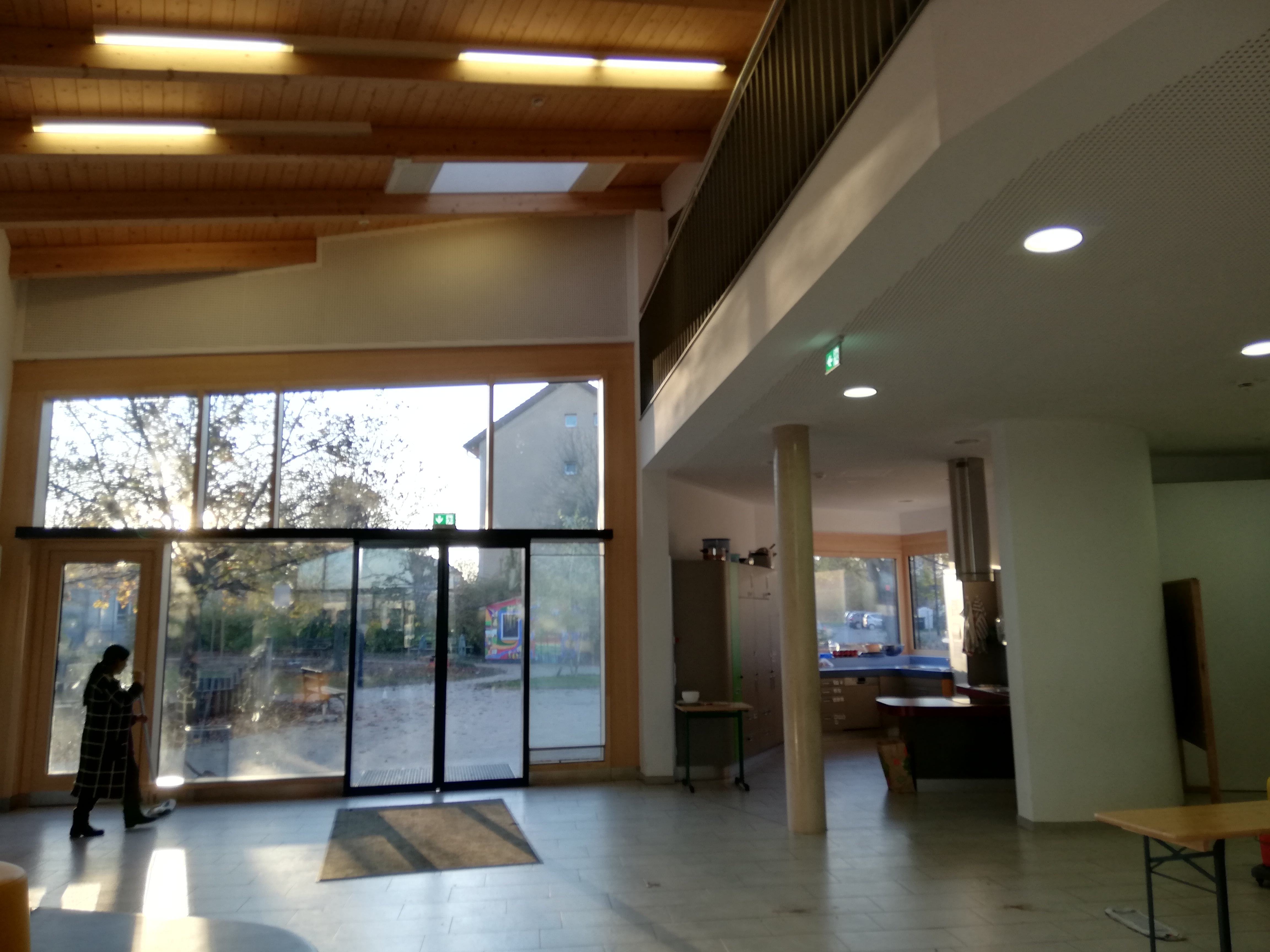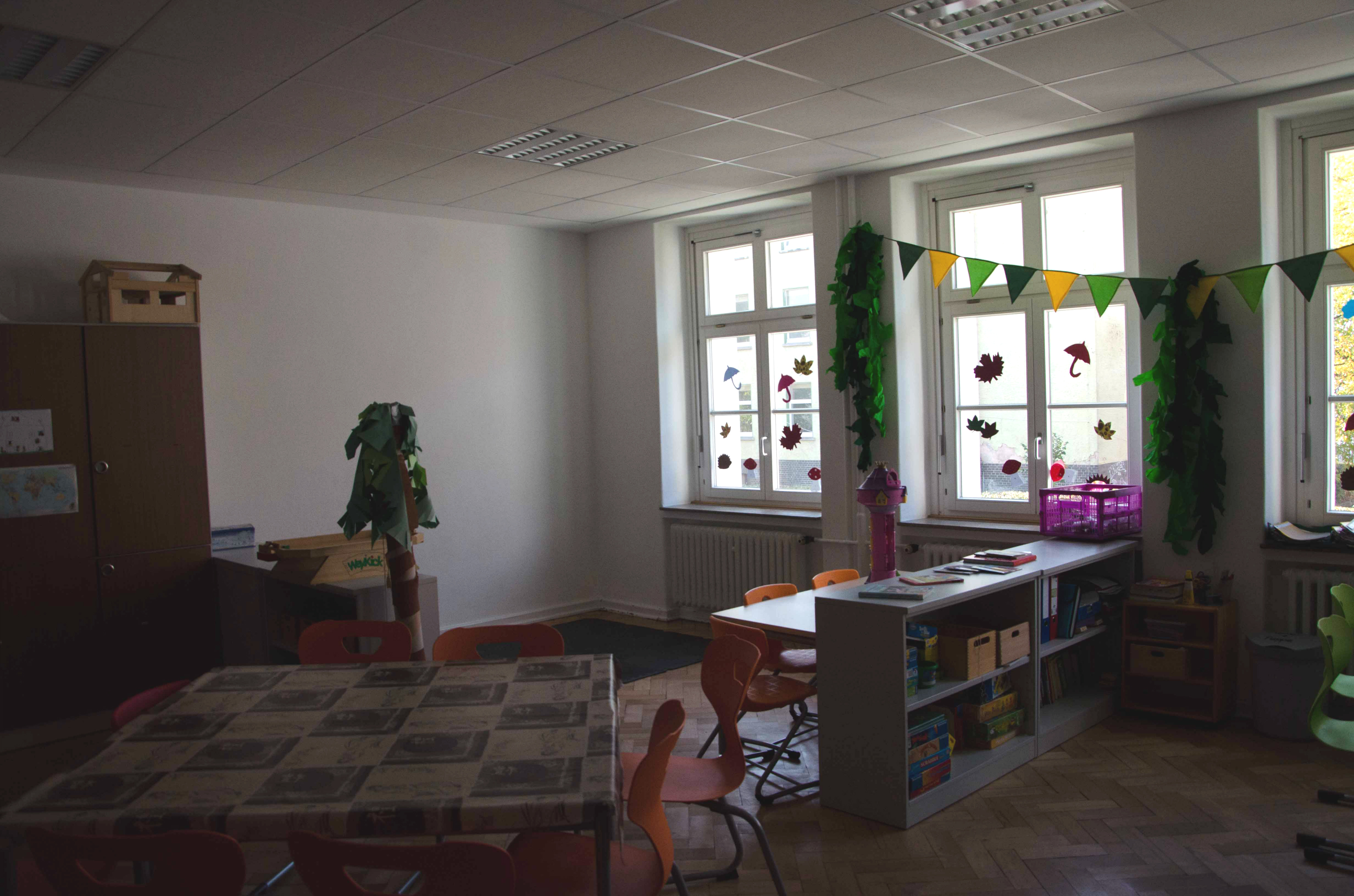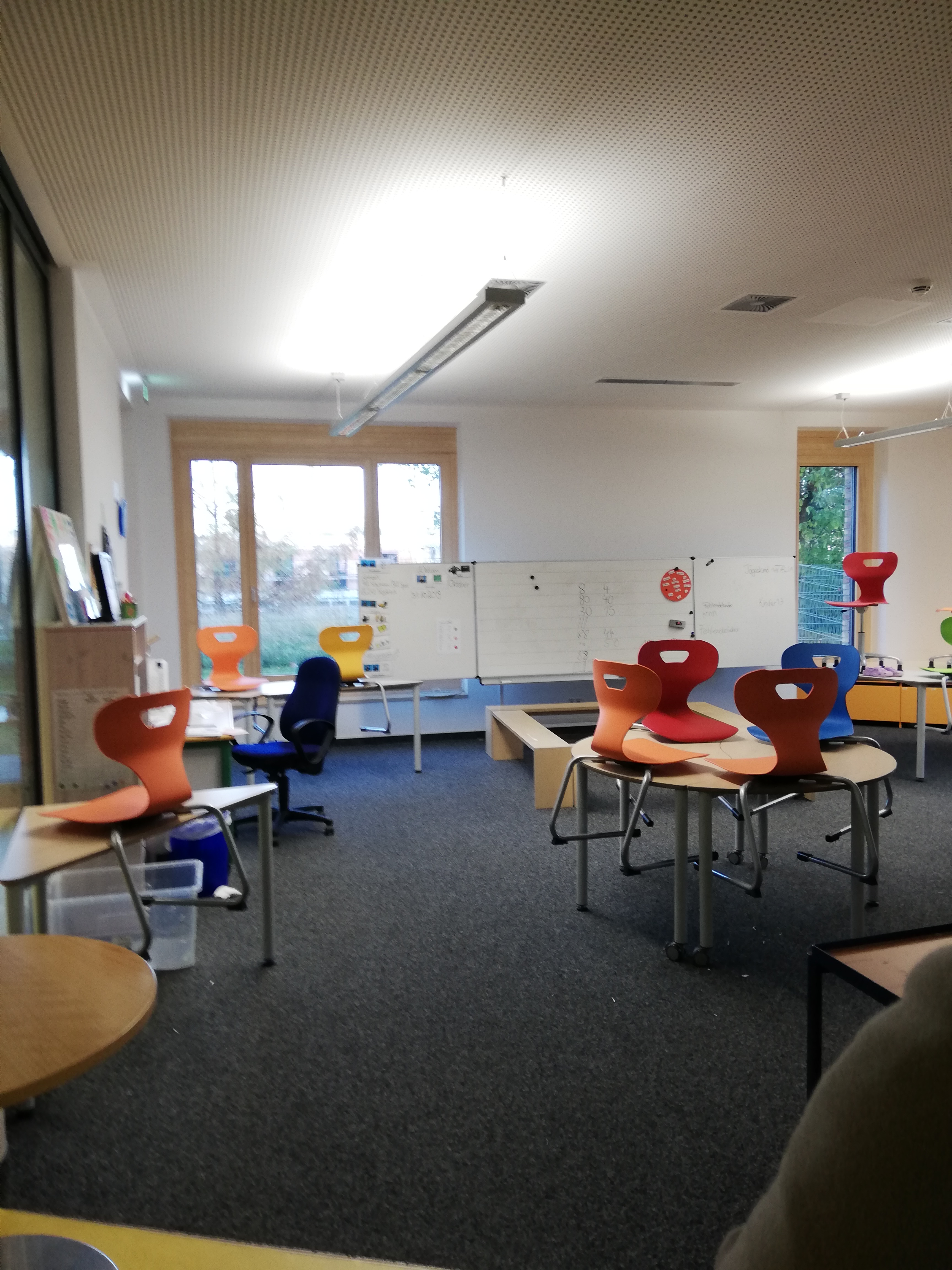 Um die Schule und deren Atmosphäre besser kennenzulernen, ging es am 31. Oktober zum Ortsbesuch nach Fulda. Das Schulgebäude ist Teil einer alten Kasernensiedlung und dementsprechend alt und sanierungsbedürftig. Außerdem reicht der Platz für die vierzügige Grundschule, also jeweils vier Klassen pro Klassenstufe, kaum aus. Einige Werkräume mussten deshalb schon in den Keller verlegt werden, der mit knapp zwei Metern Deckenhöhe doch ziemlich beengend wirkt. Die Klassenräume sind entlang eines Mittelflures angeordnet und erinnerten uns ziemlich stark an unsere eigene Grundschulzeit, die von Frontalunterricht geprägt war.